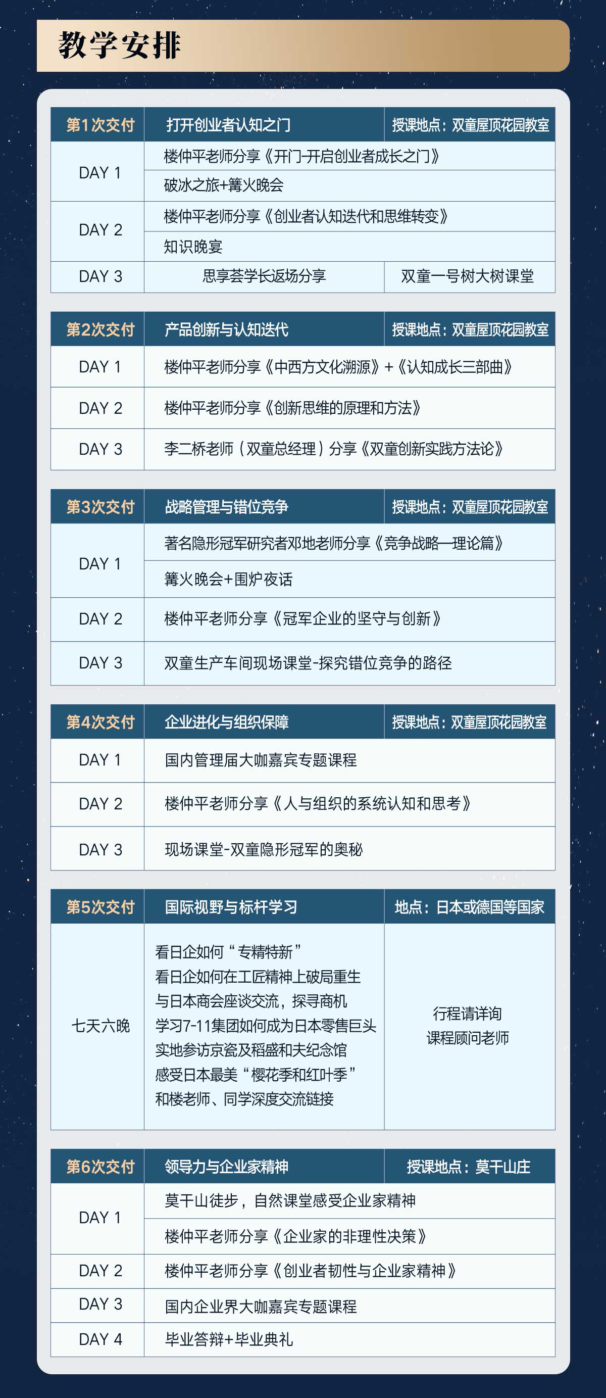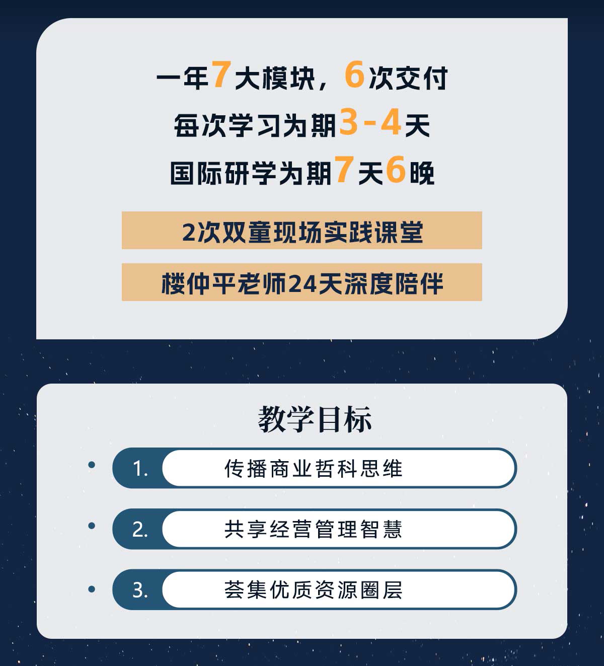 也是樓總唯一一個全面系統(tǒng)交付46年創(chuàng)業(yè)歷程的經(jīng)驗總結和思維模型的課程。全年6期課程,樓老師24天深度陪伴,從戰(zhàn)略到組織,從創(chuàng)新思維到企業(yè)家精神,幫助你的企業(yè)全方位升級。