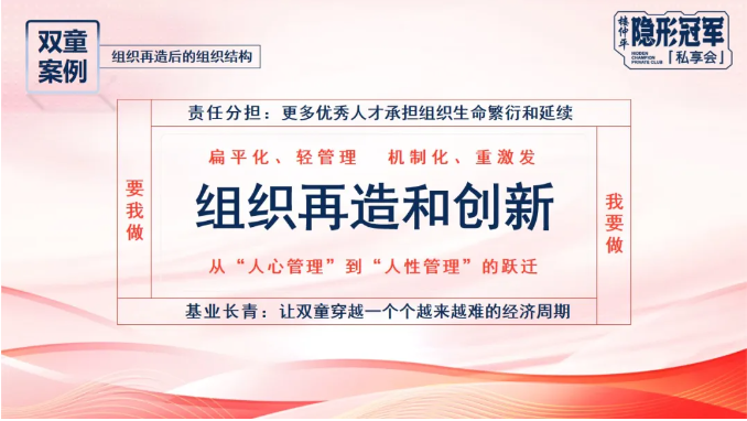 而當(dāng)下,“雙童”所推行的自主制創(chuàng)業(yè)裂變機(jī)制則是通過撬動(dòng)人性,讓更多優(yōu)秀人才承擔(dān)組織生命繁衍和延續(xù),從而讓企業(yè)實(shí)現(xiàn)基業(yè)長(zhǎng)青!