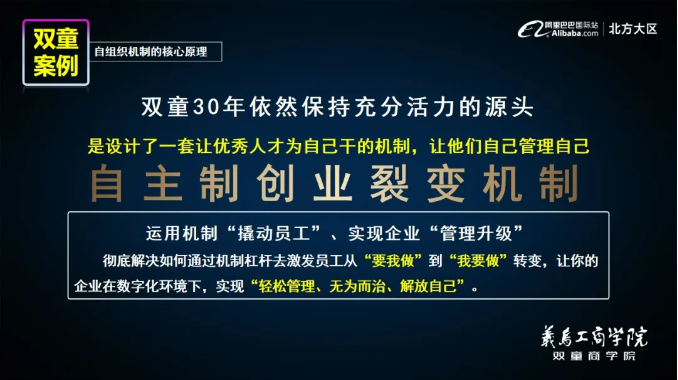 烏卡時代下,樓仲平意識到數(shù)字化只是一種技術、一個工具,最終是服務于人的。它為員工提供工作便利的同時,也讓傳統(tǒng)雇傭關系面臨瓦解。面對數(shù)字化挑戰(zhàn),“雙童”決定結合多種組織機制和中小企業(yè)的特點,自制了一套適用于中小企業(yè)的組織創(chuàng)新制度——自主制創(chuàng)業(yè)裂變機制,讓員工從“要我做”到“我要做”轉變。