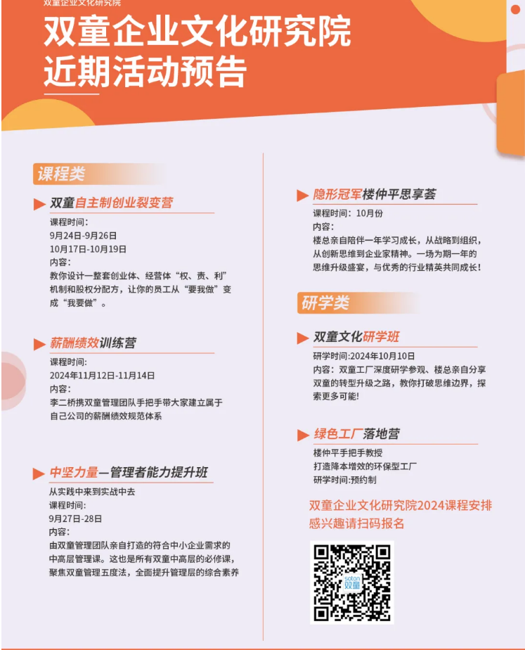 該課程將用一天的時間,帶領(lǐng)大家實地探索中國吸管博物館、“雙童”網(wǎng)紅餐廳、節(jié)能降耗系統(tǒng)、百米文化長廊、空中生態(tài)花園......除了現(xiàn)場課堂,還有創(chuàng)始人樓仲平3個小時的主題課程分享,讓學員親身感受“雙童”的經(jīng)營哲學!