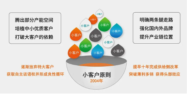 因此,“雙童”推出了小訂單策略,做出規(guī)定:要求業(yè)務(wù)員逐步放棄沒有利潤的大客戶,騰出產(chǎn)能空降培植日本和歐盟的中小客戶;拓展國內(nèi)高端市場和個(gè)性化定制,形成“兩條腿走路”布局;每個(gè)客戶的訂貨數(shù)量絕不允許超過本廠生產(chǎn)總量的5%。
