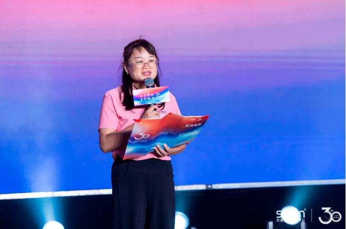 雙童三十周年慶典儀式上,員工代表張舍姣上臺(tái)分享