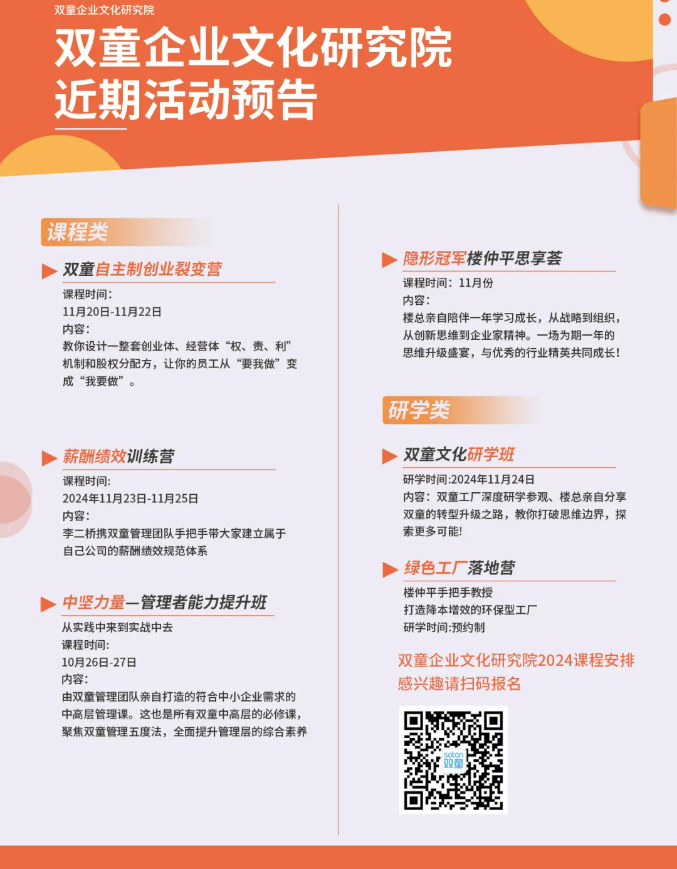 雙童的成長(zhǎng)歷程中,我們能清晰地感知到,樓總一直在尋求破界、創(chuàng)新,每當(dāng)企業(yè)趨于穩(wěn)定時(shí),他就會(huì)扮演“攪局者”的角色,打破現(xiàn)有的平衡。也正是這種“于無(wú)聲處聽(tīng)驚雷”的未雨綢繆,才能讓雙童在每次危機(jī)來(lái)臨時(shí),都能成功“闖關(guān)”,穿越一個(gè)個(gè)成長(zhǎng)周期,希望能與更多企業(yè)經(jīng)營(yíng)者共勉!