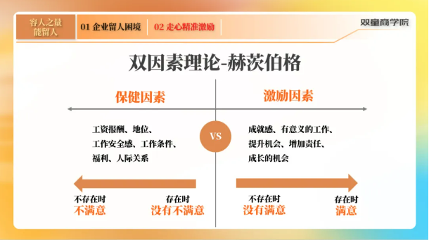 課上,程老師客觀、詳細(xì)地分析了中小企業(yè)的留人困境,而管理者有義務(wù)為企業(yè)留住優(yōu)秀人才。所以這就需要企業(yè)管理者掌握一定的專業(yè)技巧來(lái)留住員工,除了薪資待遇等保健因素外,管理者可以通過(guò)鼓勵(lì)、贊美、儀式、欣賞、成長(zhǎng)機(jī)會(huì)和關(guān)注度等來(lái)精準(zhǔn)激勵(lì)員工,減少員工流失率。