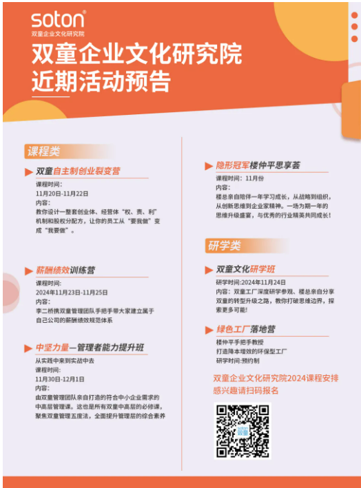 如果你也對“雙童”充滿好奇,也想賦能團隊共同成長,歡迎走進11月24日【雙童文化研學(xué)班】,與上百位優(yōu)秀的創(chuàng)業(yè)者一起學(xué)習(xí)!少量名額,歡迎咨詢鎖定!