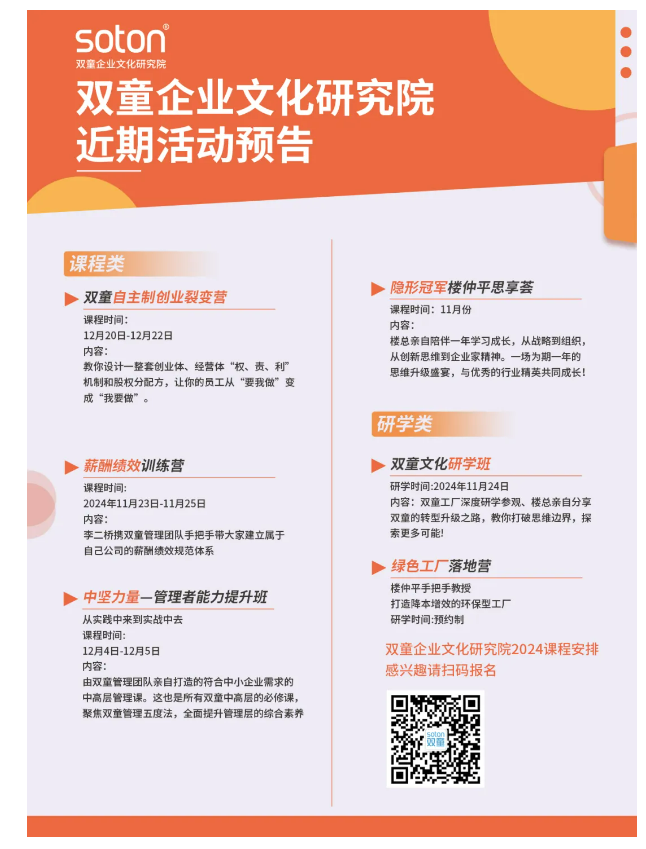 首先雙童經(jīng)過(guò)30年的發(fā)展,經(jīng)歷了粗放經(jīng)營(yíng)的“原始積累”階段,做強(qiáng)做大的“快速發(fā)展”階段、“專精特新”轉(zhuǎn)型和創(chuàng)新階段,深知中小企業(yè)各個(gè)階段的痛點(diǎn),還是首個(gè)“彼得·德魯克中國(guó)管理獎(jiǎng)”的中小企業(yè)獲得者,雙童的經(jīng)營(yíng)理念和管理體系能夠幫助更多中小企業(yè)少走彎路、少踩坑!