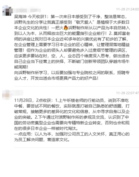 所以,在第一天的研學(xué)結(jié)束之后,同學(xué)們不僅收獲了很多關(guān)于產(chǎn)品創(chuàng)新、精細(xì)化管理等企業(yè)經(jīng)營的新靈感,對自身企業(yè)未來的經(jīng)營方向也有了不一樣的感觸: