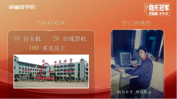 在第三期弟子班第一模塊《認(rèn)知成長“三部曲”》中(點(diǎn)擊獲取原文),樓老師告訴同學(xué)們,所謂成長是“認(rèn)知成長”,只有不斷打破思維的局限,才能實(shí)現(xiàn)認(rèn)知的升級,認(rèn)知的升級才能帶領(lǐng)企業(yè)的持續(xù)成長!在雙童有一位充滿傳奇的人,躬耕23年,他一步步完成了“一線操作工—基層管理—中高層管理—平臺總經(jīng)理”的華麗轉(zhuǎn)身,但仔細(xì)觀察就會發(fā)現(xiàn),他每一次身份的轉(zhuǎn)變背后都伴隨著一次思維認(rèn)知的提升,他就是受樓老師影響最深的“大師兄”—李二橋。所以,課研組也特別邀請他為大家?guī)砹恕度绾卧诰蜆I(yè)中創(chuàng)業(yè)》主題分享,在他解讀自己的成長歷程中,同學(xué)們可以發(fā)現(xiàn),樓老師在課上教授的知識在一次次的被驗(yàn)證。接下來,讓我們進(jìn)入“大師兄”李二橋的故事……