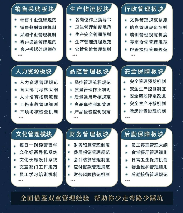 所以,入學(xué)“隱形冠軍樓仲平思享薈”之后,項(xiàng)目組會將“雙童”積累了30年、包含了銷售、生產(chǎn)、行政、人力資源、品質(zhì)、安全、文化管理、財(cái)務(wù)和后勤等9大板塊,近600份管理規(guī)范文件,全部打包給學(xué)員,幫助學(xué)員企業(yè)能夠全面借鑒雙童管理經(jīng)驗(yàn)、少走彎路、少踩坑!
