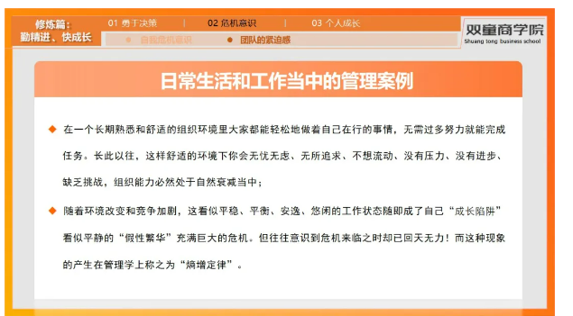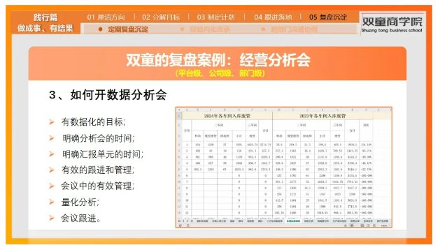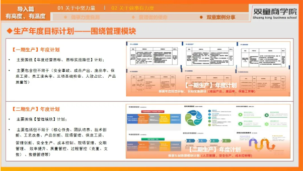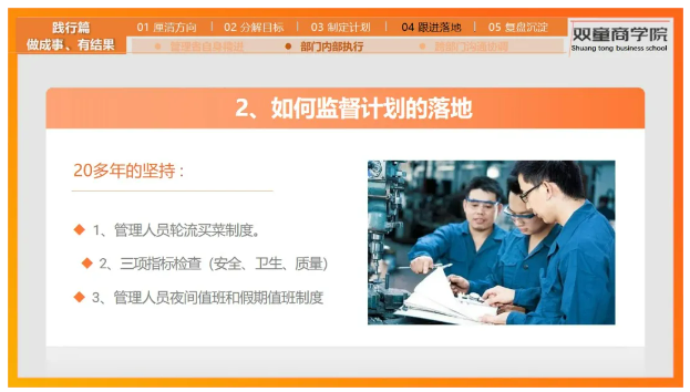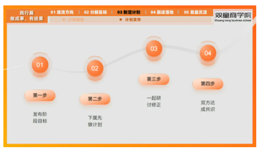 考慮到目標分解中可能會遇到的問題,如員工不配合,目標分配不公平,李二橋老師也根據(jù)雙童的案例,給出相應(yīng)的解決方案。 ③ 制定計劃 一個好的計劃 ,勝過一百次的盲目行動。 雙童“自下而上”制定計劃的方式,為學(xué)員們提供了很好的范本: