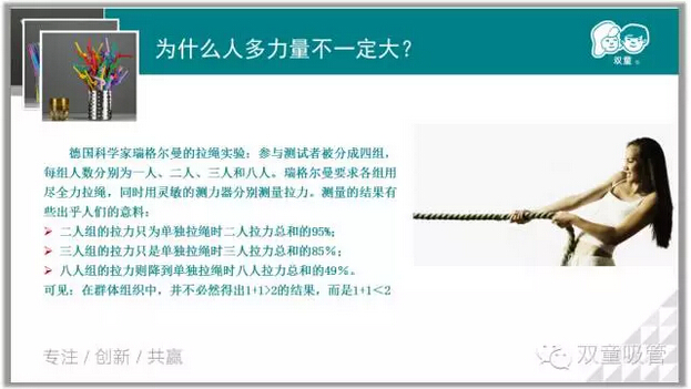 為什么人多不一定力量大呢? 德國科學(xué)家瑞格爾曼的拉繩實(shí)驗(yàn):參與測試者被分成四組,每組人數(shù)不同。測量的結(jié)果顯示人越多,反而拉力總和越小。可見:在群體組織中,并不必然得出1+1>2的結(jié)果,而是1+1<2。這也是旁觀者效應(yīng),一個(gè)人敷衍了事,兩個(gè)人互相推諉,三個(gè)人則永無成事之日。也就有了三個(gè)和尚沒水喝的故事!