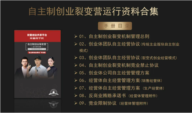 3、交付自主制創(chuàng)業(yè)裂變模式的各項規(guī)則、文本、合同等書面資料