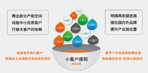因此,“雙童”推出了小訂單策略,做出規(guī)定:要求業(yè)務(wù)員逐步放棄沒有利潤的大客戶,騰出產(chǎn)能空降培植日本和歐盟的中小客戶;拓展國內(nèi)高端市場和個(gè)性化定制,形成“兩條腿走路”布局;每個(gè)客戶的訂貨數(shù)量絕不允許超過本廠生產(chǎn)總量的5%。