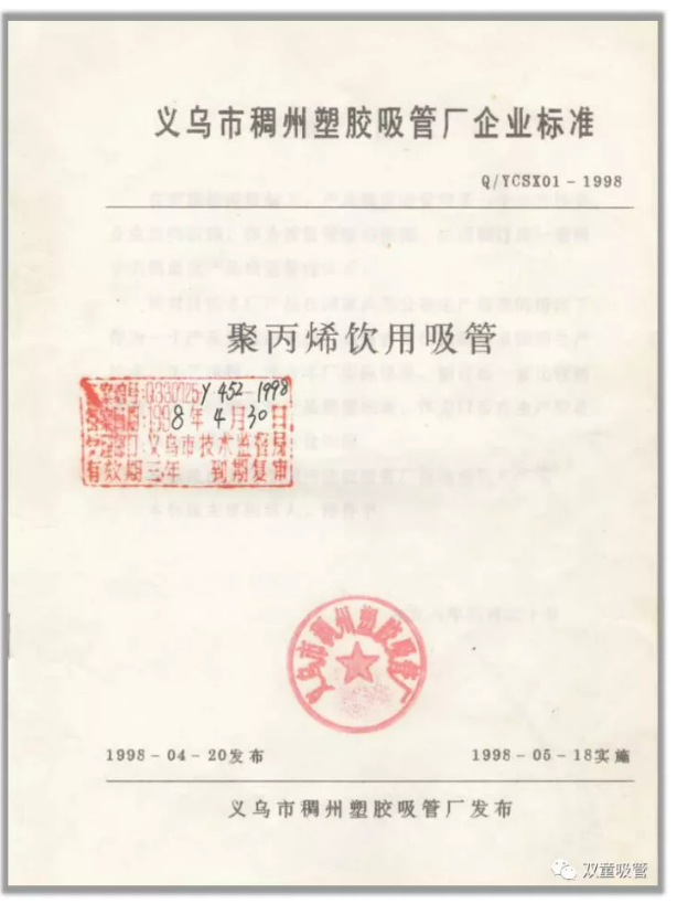 終于,在1997年10月,由“雙童”前身義烏市稠州塑膠吸管廠起草的Q/YCSX01《聚丙烯飲用吸管》企業(yè)標準審核通過,于1998年4月正式發(fā)布,成為吸管行業(yè)最早的產(chǎn)品標準。