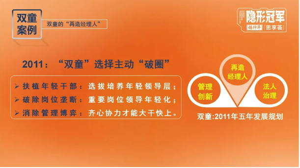 為了解決代際沖突,2011年,“雙童”開始選擇主動(dòng)破圈,再造經(jīng)理人,把空間讓給年輕人。重新組建的“雙童”行政團(tuán)隊(duì)在當(dāng)時(shí)平均年齡不到30歲,核心團(tuán)隊(duì)的大部分都是90后,新生代員工已成為“雙童”的核心管理骨干。借由2011年的五年發(fā)展規(guī)劃,“雙童”實(shí)現(xiàn)了現(xiàn)代化企業(yè)資源配置變革,解決了作為傳統(tǒng)企業(yè)的“老、大、難”問題。