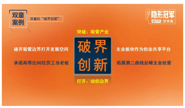 在吸管產(chǎn)品保持相對(duì)穩(wěn)定水平但很難取得新突破的情況下,經(jīng)過深度的思考、分析后“雙童”逐漸做出戰(zhàn)略調(diào)整,突破原有“只做一根吸管”的思維禁錮,打開組織邊界,通過不斷嘗試摸索,獨(dú)創(chuàng)了一套適合中小企業(yè)的裂變?cè)鲩L的創(chuàng)新模式:將主業(yè)板塊作為創(chuàng)業(yè)共享平臺(tái),拓展“第二曲線”反哺主業(yè)經(jīng)營。