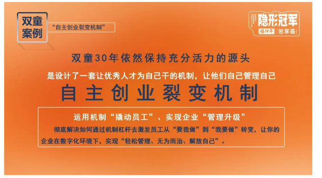 作為中國細(xì)分行業(yè)隱形冠軍企業(yè),“雙童”31年持續(xù)的創(chuàng)新和轉(zhuǎn)型,經(jīng)歷了從“作坊企業(yè)—專精特新--隱形冠軍—第二曲線”的全生命發(fā)展周期,更懂得中小企業(yè)在“隱形冠軍”之路中各個(gè)階段遇到的痛點(diǎn)、難點(diǎn)。
