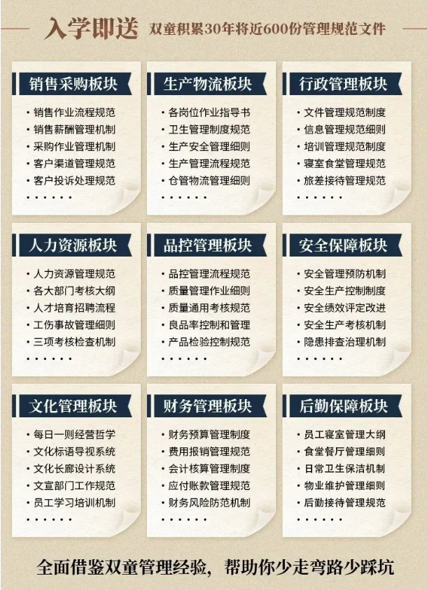 所以,入學(xué)“隱形冠軍樓仲平思享薈”之后,項(xiàng)目組會(huì)將“雙童”積累了31年、包含了銷售、生產(chǎn)、行政、人力資源、品控、安全、文化管理、財(cái)務(wù)和后勤等9大板塊,近600份管理規(guī)范文件,全部打包給學(xué)員,幫助學(xué)員企業(yè)能夠全面借鑒雙童管理經(jīng)驗(yàn)、少走彎路、少踩坑!