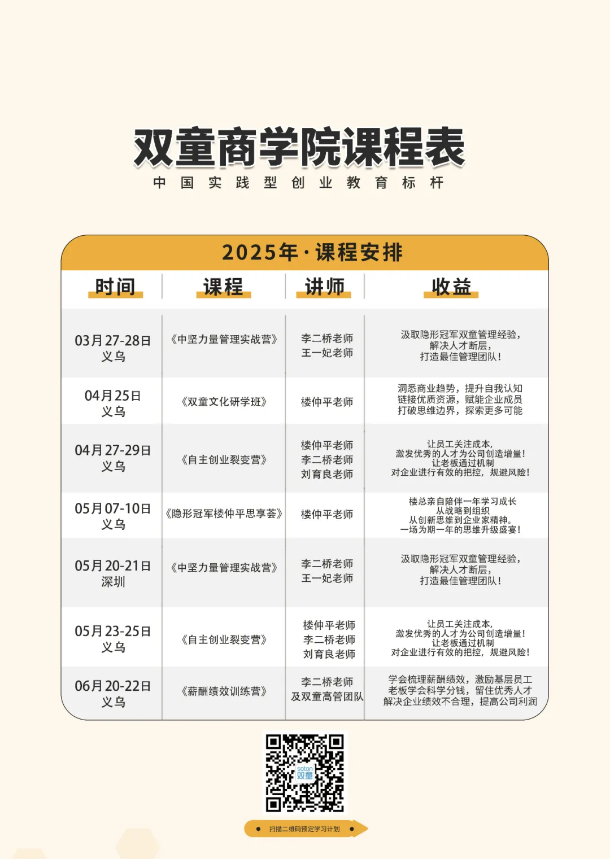 當然,除了現(xiàn)場課堂,還有創(chuàng)始人樓仲平老師的主題課程分享,更有分享結(jié)束后,還將以問答互動的形式為學員們解答參觀過程中疑惑、或者企業(yè)發(fā)展中遇到的問題,讓大家在研學活動中避免走馬觀花,真正找到“雙童”經(jīng)營過程中的科學管理邏輯,實現(xiàn)創(chuàng)業(yè)思維的升階!