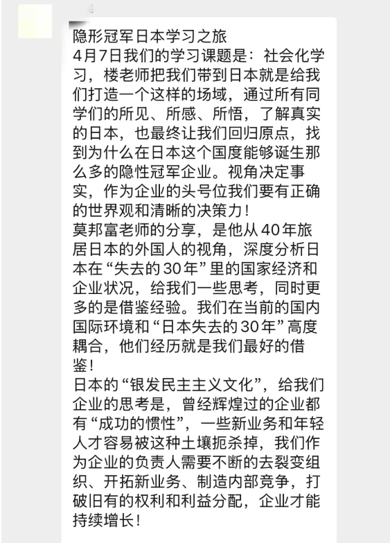 對于企業(yè)研學(xué)要學(xué)什么,他也提出了自己的建議:“看無形、觀無形”。比起硬件設(shè)施,在企業(yè)管理上學(xué)習(xí)日本企業(yè)的匠心精神和落地精益管理理念才更有長期價值!這也讓同學(xué)們更明確了在接下來的入企研學(xué)中要怎么看,看什么。
