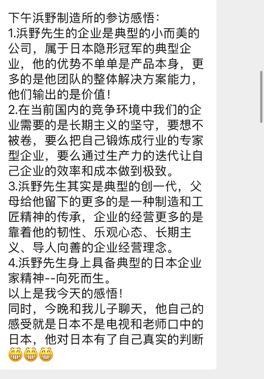 浜野制作所是小而美的企業(yè)典范,屬于日本隱形冠軍企業(yè)的代表。它的成功轉(zhuǎn)型,展示了日本企業(yè)在面對經(jīng)濟挑戰(zhàn)時的適應(yīng)力和創(chuàng)新能力,這也正是同學(xué)們當(dāng)下面對相似的國內(nèi)經(jīng)營環(huán)境,需要向標(biāo)桿企業(yè)學(xué)習(xí)并掌握的關(guān)鍵點。而浜野先生身上所具備的工匠精神和向死而生的企業(yè)家精神同樣值得我們深入學(xué)習(xí)!