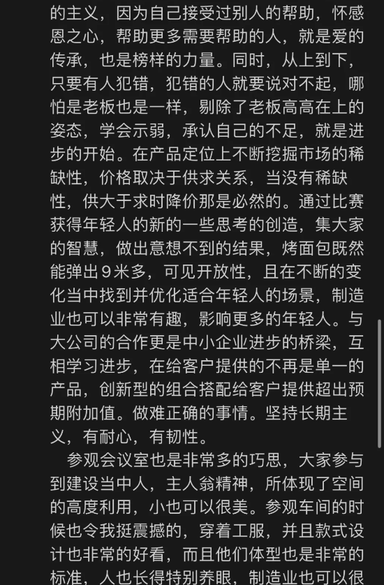 所以,在第一天的研學(xué)結(jié)束之后,同學(xué)們不僅收獲了很多關(guān)于精細(xì)化管理等企業(yè)經(jīng)營的新靈感,對自身企業(yè)未來的經(jīng)營方向也有了新的思考與感悟: