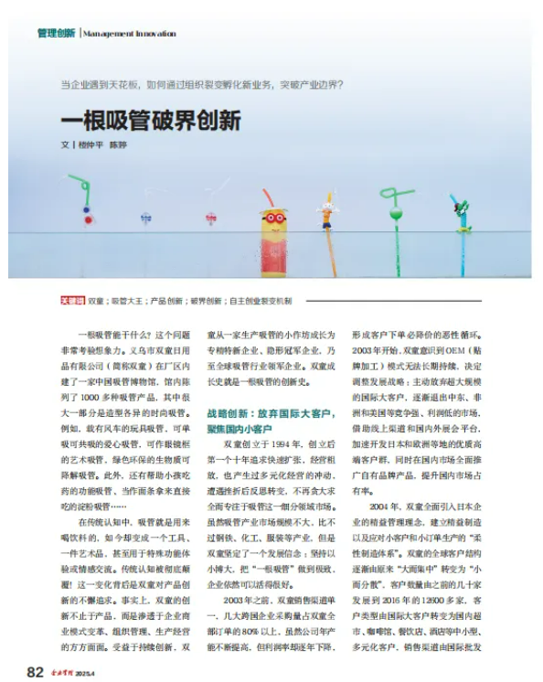 在傳統(tǒng)認(rèn)知中,吸管就是用來喝飲料的,如今卻變成一個(gè)工具、一件藝術(shù)品,甚至用于特殊功能體驗(yàn)或情感交流。傳統(tǒng)認(rèn)知被徹底顛覆!這一變化背后是雙童對(duì)產(chǎn)品創(chuàng)新的不懈追求。事實(shí)上,雙童的創(chuàng)新不止于產(chǎn)品,而是滲透于企業(yè)商業(yè)模式變革、組織管理、生產(chǎn)經(jīng)營的方方面面。受益于持續(xù)創(chuàng)新,雙童從一家生產(chǎn)吸管的小作坊成長(zhǎng)為專精特新企業(yè)、隱形冠軍企業(yè),乃至全球吸管行業(yè)領(lǐng)軍企業(yè)。雙童成長(zhǎng)史就是一根吸管的創(chuàng)新史。