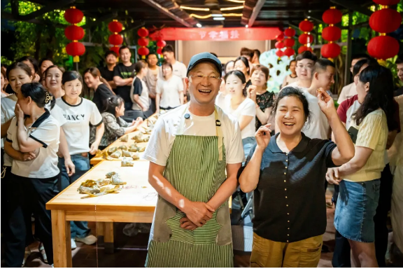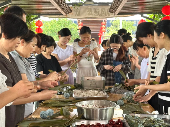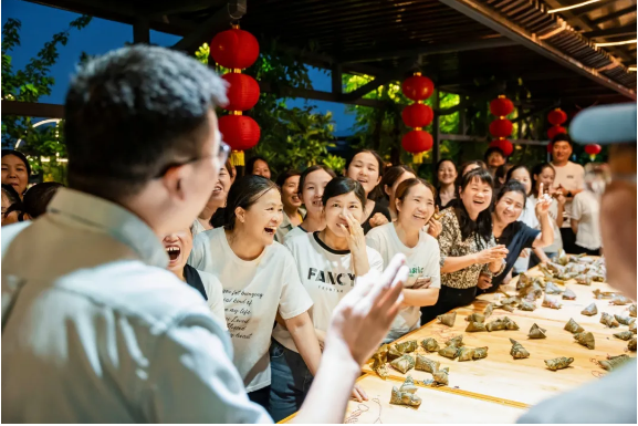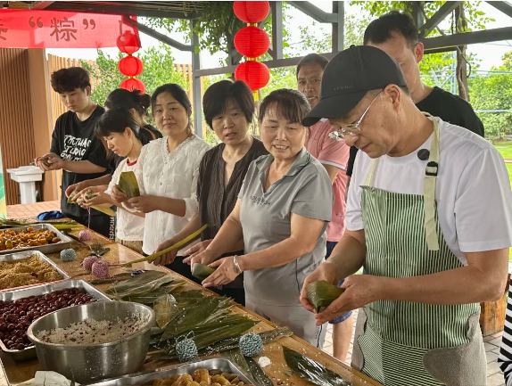 由于各個(gè)崗位的年輕人都沒有親自做過粽子,手忙腳亂地做出來的粽子始終不成型。樓總便趕忙邀請了他的幾位親戚過來做“指導(dǎo)老師”,現(xiàn)場手把手傳承包粽子手藝。