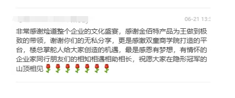 他以運(yùn)營總經(jīng)理吳春云曾經(jīng)發(fā)的一段話作為結(jié)尾:我們當(dāng)以隱形冠軍之名,列鴻鵠之志,持堅韌之心,深耕細(xì)作,勇攀高峰。未來征途,我們必將在各自領(lǐng)域發(fā)光發(fā)熱,也期待著下次相聚。我們都已成為更好的自己,共同見證更多隱形冠軍的誕生!