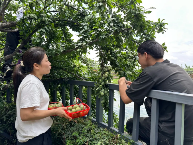 在采摘的過程中,發(fā)現(xiàn)一棵李子樹臨水生長,很多大果、紅果都在池塘那邊。見此,大家都犯了難,猶豫要不要放棄這棵樹上的果實(shí)。突然,一聲“讓我來”奪去了大家的注意力,一位員工自告奮勇,他嘿嘿一笑,說“這里水又不深,我下去一趟就是了。這么好的果子,不摘不就浪費(fèi)掉了?”轉(zhuǎn)即,他拿來了下水的膠褲和膠鞋,扶著欄桿,小心地下了水,麻溜地摘了起來。不多時,李子又摘了一籮筐,他高興地舉起籃子,臉上洋溢著興奮的笑容。生態(tài)園里此起彼伏的歡呼聲化作豐收的樂章。不少員工捧著剛摘的“糖心李”現(xiàn)場開吃:“真的好甜,小的李子比大的還有味道呢!”有些員工干脆現(xiàn)采現(xiàn)吃,和大家邊吃邊嘮嗑:“這可比超市買的香多了,又無污染無公害的!”