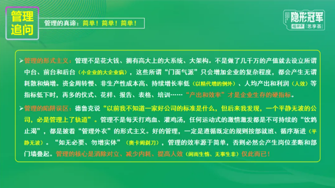 而管理的真諦則是“簡單”,一定要避免追求形式主義。樓老師用一家家具企業(yè)的典型案例來警示同學(xué)們:管理的效率源于簡單,否則容易產(chǎn)生崗位壟斷和部門墻,小企業(yè)也會染上大企業(yè)病。