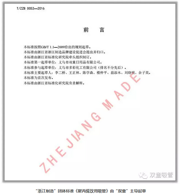 雖說“雙童”是吸管產品的行業(yè)標準、國家標準和ISO國際標準的第一起草編制單位,但得知“雙童”又作為主要起草編制單位編制的“浙江制造”《聚丙烯飲用吸管》標準正式發(fā)布,吸管妞還是很激動!因為這可不是簡單的區(qū)域標準!什么樣的產品可以稱為“浙江制造”?品牌需集質量、技術、服務、信譽為一體,經市場與社會公認,能代表浙江制造業(yè)先進性的區(qū)域品牌形象標識,是浙江制造業(yè)的“標桿”和“領導者”,是高品質水平的“代名詞”。