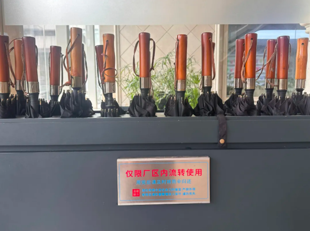 如今,"雙童"的流動(dòng)傘設(shè)施已形成完善的服務(wù)體系。在行政樓、生產(chǎn)車(chē)間、餐廳、宿舍等6個(gè)人流量大的區(qū)域,300余把雨傘隨時(shí)待命,確保員工在廠區(qū)任何位置都能就近取用,真正實(shí)現(xiàn)了"雨天無(wú)憂",最大化地解決員工雨天出行難的窘境。