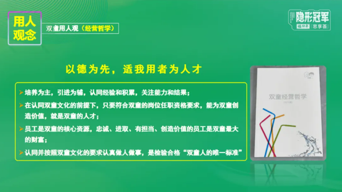 解決了選人問題,那如何讓人才發(fā)揮該有的作用呢?李二橋老師隨即分享了雙童的用人理念,為學員提供了具有實踐意義的參考。雙童的核心用人原則是“以德為先,適我用者為才”,強調(diào)內(nèi)部培養(yǎng)為主、外部引進為輔,既重視經(jīng)驗積累,更看重實際能力與成果輸出。