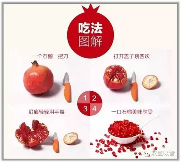 石榴可謂全身是寶:葉子可止瀉、皮曬干可補(bǔ)血養(yǎng)氣,還有疏肝柔肝、寧心定志的作用呢!石榴的寓意更是美好,有著紅紅火火、多子多孫的寓意!要說石榴的剝法,吸管妞做為專業(yè)吃貨,自然有妙招!快戳下圖↓