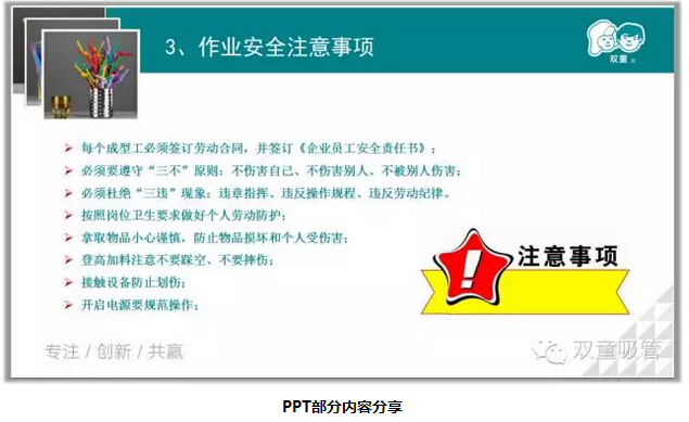 10月4日晚七點(diǎn)半,“雙童”九樓閣人聲鼎沸,我們“雙童”第157期學(xué)習(xí)會開始啦!這堂課繼續(xù)上次吸管成型工技能培訓(xùn)的話題,由生產(chǎn)廠長李秀前為大家講解成型工崗位上衛(wèi)生管理、質(zhì)量管理、操作規(guī)范和安全管理等知識!
