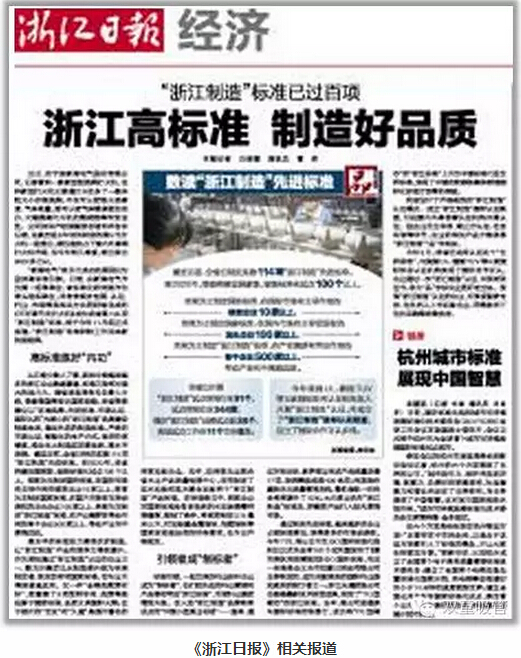2014年底,浙江在全國(guó)率先以標(biāo)準(zhǔn)和認(rèn)證為手段打造首個(gè)區(qū)域性公共品牌——“浙江制造”品牌。“浙江制造”標(biāo)準(zhǔn)比國(guó)家及行業(yè)標(biāo)準(zhǔn)要求要高,基本達(dá)到國(guó)際先進(jìn)、國(guó)內(nèi)一流水平。通過(guò)制定先進(jìn)標(biāo)準(zhǔn),越來(lái)越多的企業(yè)占領(lǐng)標(biāo)準(zhǔn)高地,獲得更多的市場(chǎng)話語(yǔ)權(quán)。近日,《浙江日?qǐng)?bào)》也發(fā)布了一篇《浙江高標(biāo)準(zhǔn),制造好品質(zhì)》的報(bào)道。