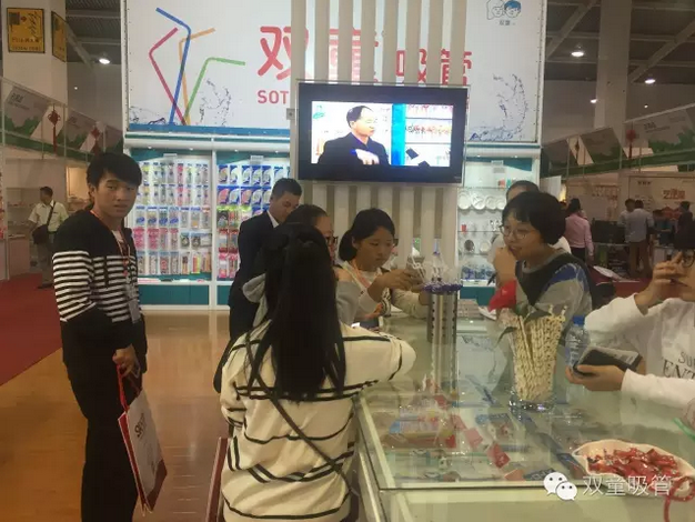 經(jīng)過雙童經(jīng)過的客商基本都會留下腳步。原來是雙童展位的正中央掛著一臺大尺寸的電視機,不間斷的滾動播放當家人接受的各類節(jié)目采訪,以及各類媒體對雙童吸管進行報道的視頻!看來咱們當家人的魅力還真是大呀!