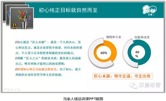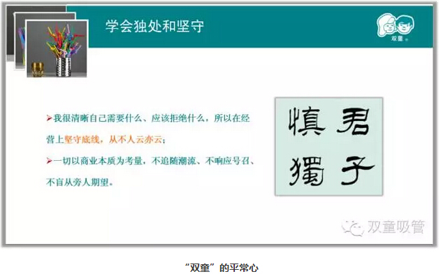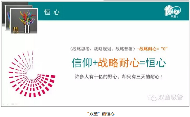 “恒心”是用長(zhǎng)遠(yuǎn)的眼光去看問題,我們強(qiáng)調(diào)戰(zhàn)略思考、戰(zhàn)略規(guī)劃、戰(zhàn)略部署,唯獨(dú)缺少戰(zhàn)略耐心。“雙童”堅(jiān)持小客戶原則,堅(jiān)持對(duì)員工投入,堅(jiān)持走差異化的道路,“雙童”的發(fā)展也越來越好。創(chuàng)新就是改變,就是持續(xù)積累。創(chuàng)新需要戰(zhàn)略耐心,需要十年為一個(gè)單位的恒心。