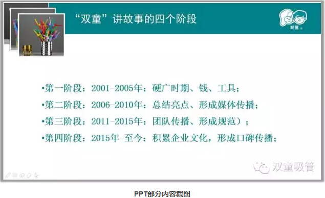 課程開始,吸管妞也從“雙童”是如何做自媒體傳播的故事開始講起。沒想到,原來“雙童”的文化傳播還分為好幾個階段,從硬廣時期,到后來的塑造差異化亮點,引導媒體給“雙童”講故事,再到成立文宣部門,形成團隊“講故事”,最后達到形成企業(yè)文化,形成口碑傳播。“雙童”之所以有今天的文化影響力,與當家人樓總的遠見卓識是密不可分的!