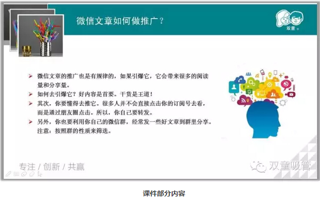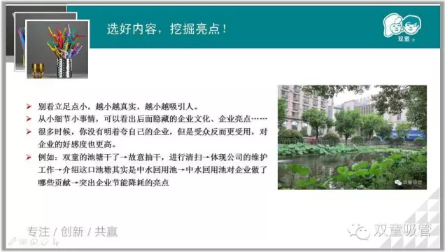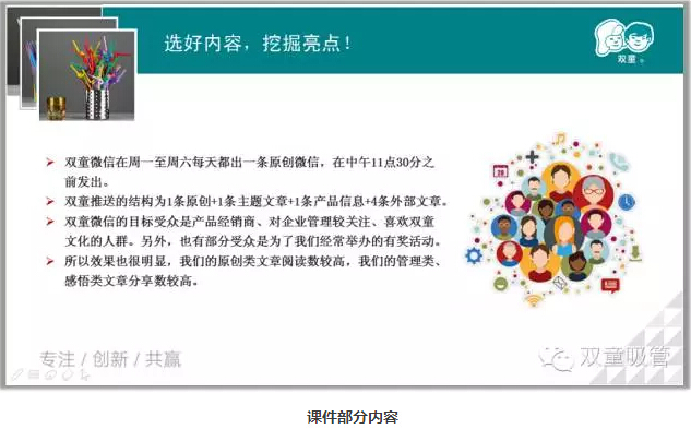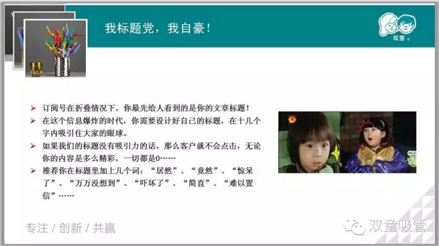 微信也是講故事的一種傳播方式,用微信公眾平臺作為營銷和品牌推廣工具已是眾大企業(yè)和商家的不二之選。那么,究竟如何才能事半功倍地運營微信公眾平臺呢?不吹牛的說,吸管妞經(jīng)常能聽到一些朋友對“雙童吸管”微信公眾平臺的夸贊,說這是義烏企業(yè)界運營得最好的微信公眾號。接下來妞和大家分享在運營“雙童吸管”微信公眾號時所積累的一些經(jīng)驗,把它們做成PPT分享給大家,共同分享,共同進步!