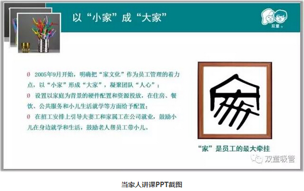 當家人樓總始終認為只有員工幸福企業(yè)才能幸福,只有改變員工才能改變產(chǎn)品從而改變企業(yè)。“雙童”意識到“人心管理”就是“人性”的需求管理,是企業(yè)生態(tài)系統(tǒng)建設的源頭問題。所以“雙童”明確把“家文化”作為員工管理的著力點,以“小家”形成“大家”。除了給員工提供優(yōu)質(zhì)硬件,從生態(tài)上保障員工珍惜環(huán)境所在,同時通過意識引導、規(guī)則管理讓員工的觀念進行轉(zhuǎn)變,從而用“心”生產(chǎn)出更好的產(chǎn)品!