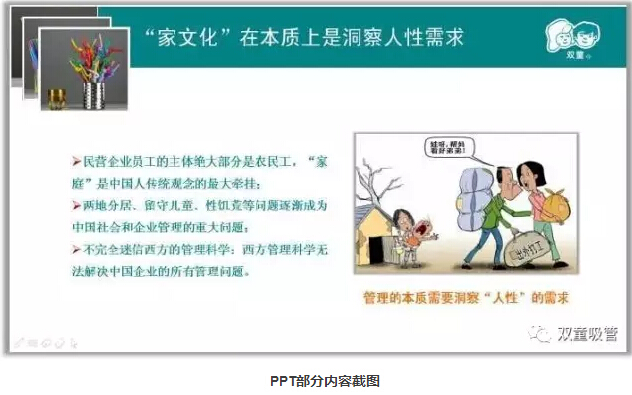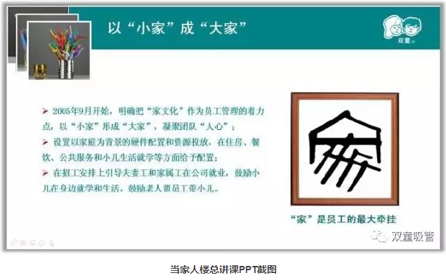 “雙童”逐漸認(rèn)知到:“家”是員工最大的牽掛,只有改變員工才能改變產(chǎn)品從而改變企業(yè)。“人心”最難管,員工沒有了牽掛,才能全身心投入到工作當(dāng)中,才能做出更加完美精細(xì)的產(chǎn)品,人心管理就是企業(yè)生態(tài)系統(tǒng)的改善。從2005年9月開始,“雙童”明確把“家文化”作為員工管理的著力點(diǎn),以“小家”形成“大家”,凝聚團(tuán)隊(duì)“人心”!