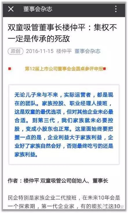 無論兒子來與不來,實際運營者,都是現(xiàn)在的團隊。家族控股、職業(yè)經(jīng)理人接班,這是“雙童”的最優(yōu)選項,但對其他企業(yè)未必最合適。到第三代,我們家族就未必要控股,變成小股東也正常。這里面始終要把握一點的是,企業(yè)利益大于家族利益,企業(yè)好了家族自然會好,否則最終吃虧的還是家族利益。一般來講,企業(yè)的創(chuàng)始人總是希望企業(yè)能持續(xù)地傳承下去,而這里所指的“傳承”并非一定要子女接班,我認(rèn)為這才是理性的商業(yè)思維。