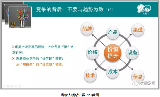 當(dāng)家人樓總圍繞“匠人思維”的商業(yè)本質(zhì)、“競(jìng)爭(zhēng)”的商業(yè)本質(zhì)兩方面進(jìn)行分享!首先當(dāng)家人樓總講述了他對(duì)“匠人思維”的理解,從本質(zhì)上來講“匠人”不只是為他人著想,更不是大公無私,而是基于理性、立足客觀、看的長(zhǎng)遠(yuǎn)。只有遵循商業(yè)本質(zhì),凡事長(zhǎng)遠(yuǎn)計(jì)議,以利他之心去經(jīng)營(yíng)才能把事業(yè)做好。同時(shí),當(dāng)家人樓總也和大家分享了“雙童”的發(fā)展也一直圍繞著“匠人之心”——“初心”、“恒心”、“平常心”。