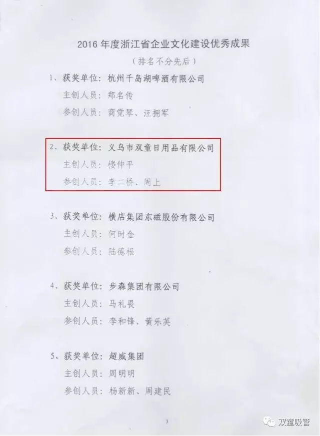 今年上半年,浙江省企業(yè)聯(lián)合會進行了2016年度浙江省企業(yè)文化建設優(yōu)秀成果的評選活動。這不,最近傳來了好消息,這次一共有五家企業(yè)獲得此項殊榮,“雙童”作為義烏唯一一家獲獎企業(yè)也名列其中呢!大家是不是很好奇“雙童”是如何建設企業(yè)文化的呢?下面吸管妞就帶大家來一看究竟吧!