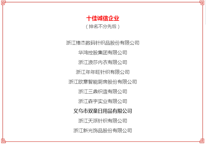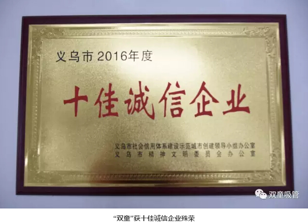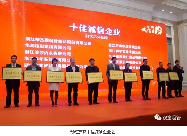 1月9日上午,義烏市2017年“誠(chéng)信日”暨“義烏中國(guó)小商品城”品牌授權(quán)儀式在幸福湖隆重舉行!為褒揚(yáng)守信主體、營(yíng)造誠(chéng)信氛圍,當(dāng)天還舉行了首屆守信“紅名單”發(fā)布儀式,為“十佳誠(chéng)信企業(yè)”、“十佳誠(chéng)信外商”、“十佳誠(chéng)信電商”和“十佳誠(chéng)信經(jīng)營(yíng)戶”授牌。“雙童”也名列其中,成為“十佳誠(chéng)信企業(yè)”之一!