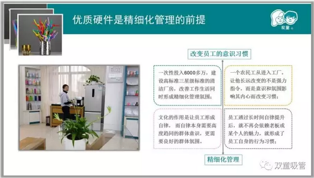 “雙童”給員工用五星級的硬件,也是引導(dǎo)員工改變自身的思維和行為方式,讓員工關(guān)注細(xì)節(jié)!質(zhì)量是用“心”做出來的,通過這樣的氛圍影響員工的內(nèi)心,員工的素質(zhì)和質(zhì)量意識才能進(jìn)一步提升!因此優(yōu)質(zhì)硬件是生產(chǎn)優(yōu)質(zhì)產(chǎn)品的必要前提,有高品質(zhì)的硬件為基礎(chǔ),員工才能用“心”做出更好產(chǎn)品,我們的產(chǎn)品才能更加精致完美!