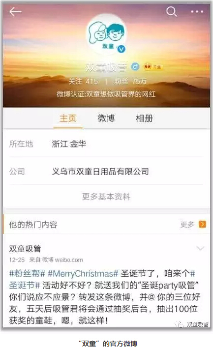 目前,“雙童”的官方微博和官方微信平臺是義烏企業(yè)界公認的優(yōu)秀模板之一。通過我們近百萬的官方微博微信平臺的宣傳、企業(yè)官方網(wǎng)站的更新宣傳,使大眾更全面地了解到了“雙童”的企業(yè)文化,加強了與外界的溝通聯(lián)系,帶動了“雙童”文化與品牌的傳播。除此之外,我們也會定期舉辦線上及線下粉絲交流會,和粉絲們一起互動交流!