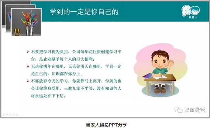 學(xué)歷≠知識、才人≠人才,樓總也鼓勵大家,一定要堅持學(xué)習(xí),學(xué)習(xí)并不是學(xué)校里才需要做的事!如果工作以后就不思進(jìn)取,不學(xué)習(xí)提升,就算是博士生,“雙童”也不會對你敞開大門!而對于那些肯學(xué)習(xí)、肯鉆研的員工,“雙童”會提供非常多的學(xué)習(xí)機(jī)會和提升空間,讓你在“雙童”有一個更好的發(fā)展!就算有一天你離開了“雙童”,你學(xué)到的始終是你自己的!